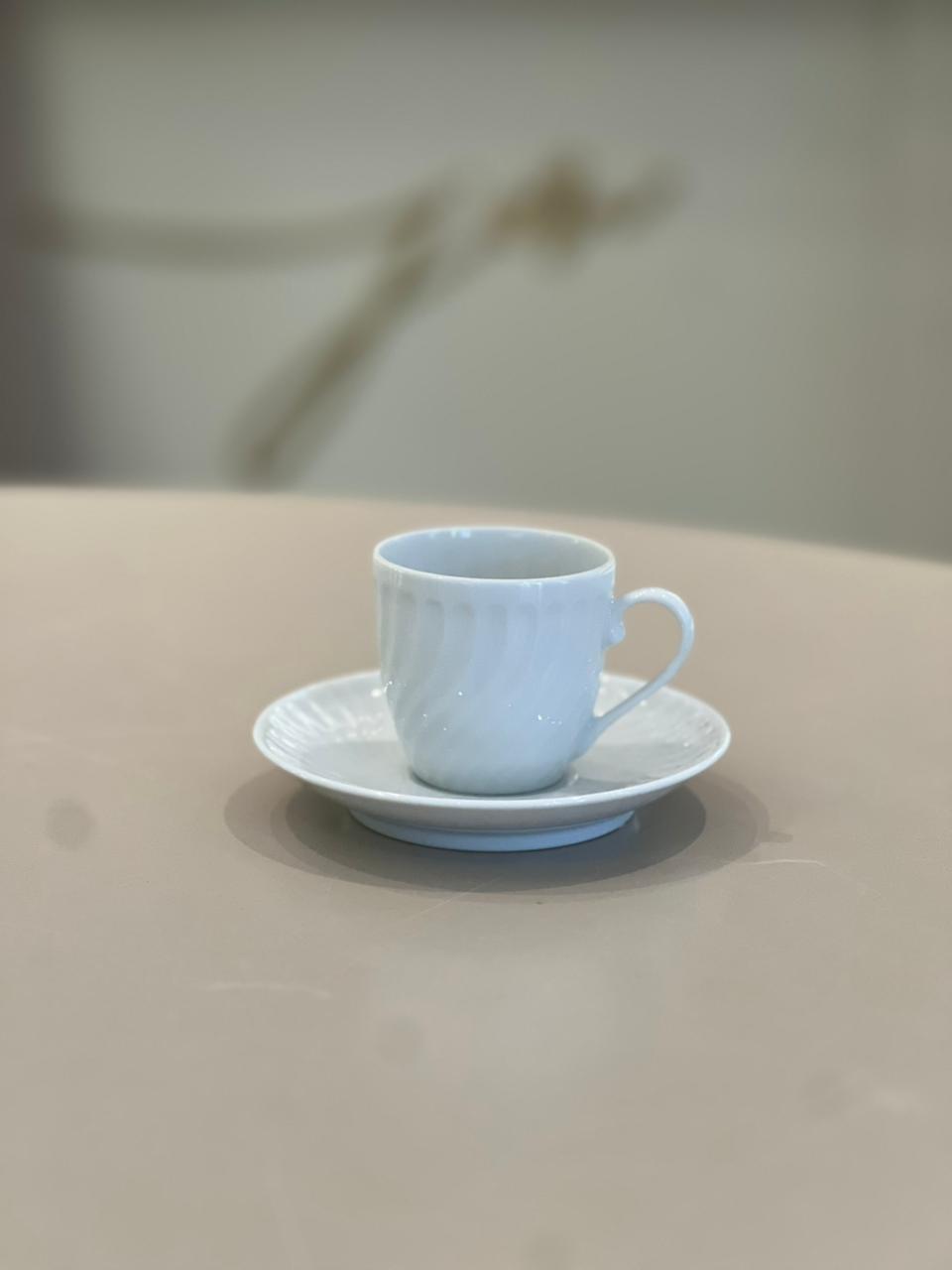 Chávena Café com Pires Sagres. Sagres é um modelo clássico e requintado, com motivos relevados na aba, formando um suave ondulado, evocativo do mar desbravado pelos nossos navegadores.