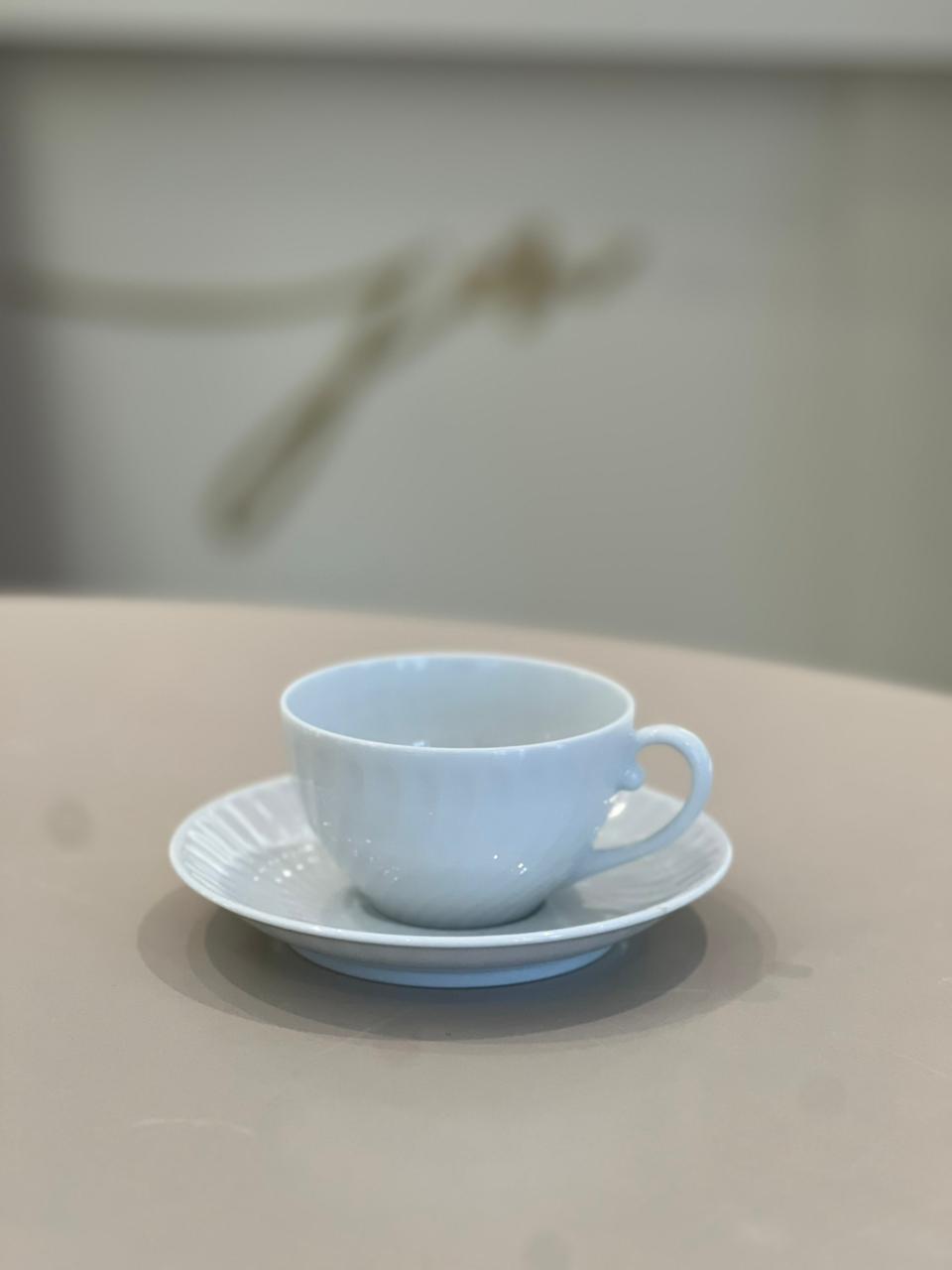 Chávena Chá com Pires Sagres. Sagres é um modelo clássico e requintado, com motivos relevados na aba, formando um suave ondulado, evocativo do mar desbravado pelos nossos navegadores.